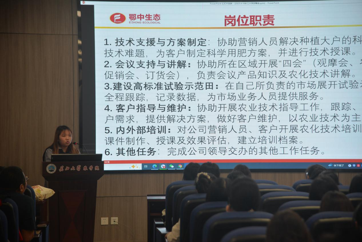 此次宣講會吸引了多家知名農(nóng)業(yè)企業(yè),如鄭州鄭氏化工、山東中農(nóng)聯(lián)合作物科學(xué)技術(shù)有限公司、湖北鄂中生態(tài)農(nóng)業(yè)科技有限公司、陜西美邦藥業(yè)集團(tuán)、廣東中迅農(nóng)科股份有限公司、正大飼料(潛江)有限公司參與,企業(yè)代表介紹品牌文化、業(yè)務(wù)及招聘崗位,學(xué)子專注聆聽并互動,現(xiàn)場交流氛圍熱烈且高效。