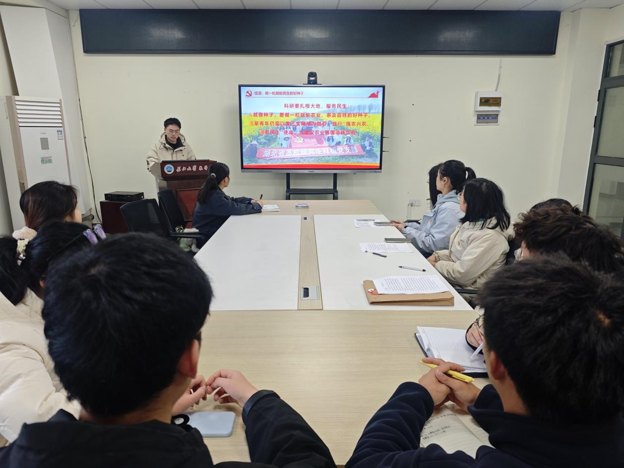 在交流研討環(huán)節(jié),與會黨員以“深入學習貫徹黨的二十屆四中全會精神,結合《奮進“十五五”建功“雙一流”——長江大學2026年新年獻詞》為主題展開討論。王紫宜、帥亞婷、蔡露同志表示,將以長大精神為指引,立足專業(yè)研究,扎根基礎領域、積極交流學習,深耕綠色防控病蟲害研究,以專業(yè)本領為農業(yè)強國和母校“雙一流”建設助力;將緊扣農業(yè)生產實際,完成畢業(yè)論文并凝練落地成果,秉持長大精神聚焦流域作物病害防控,為農業(yè)安全獻力,為守護湖北糧食安全筑牢“隱形防線”。